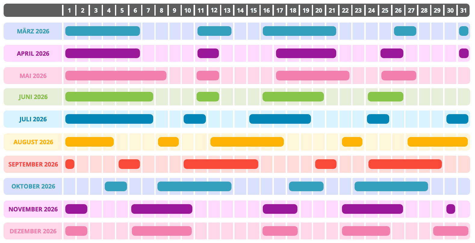 Alle Termine, an denen die Speicherstadt ziemlich sicher angefahren wird, sind mit einem farbigen Balken markiert.